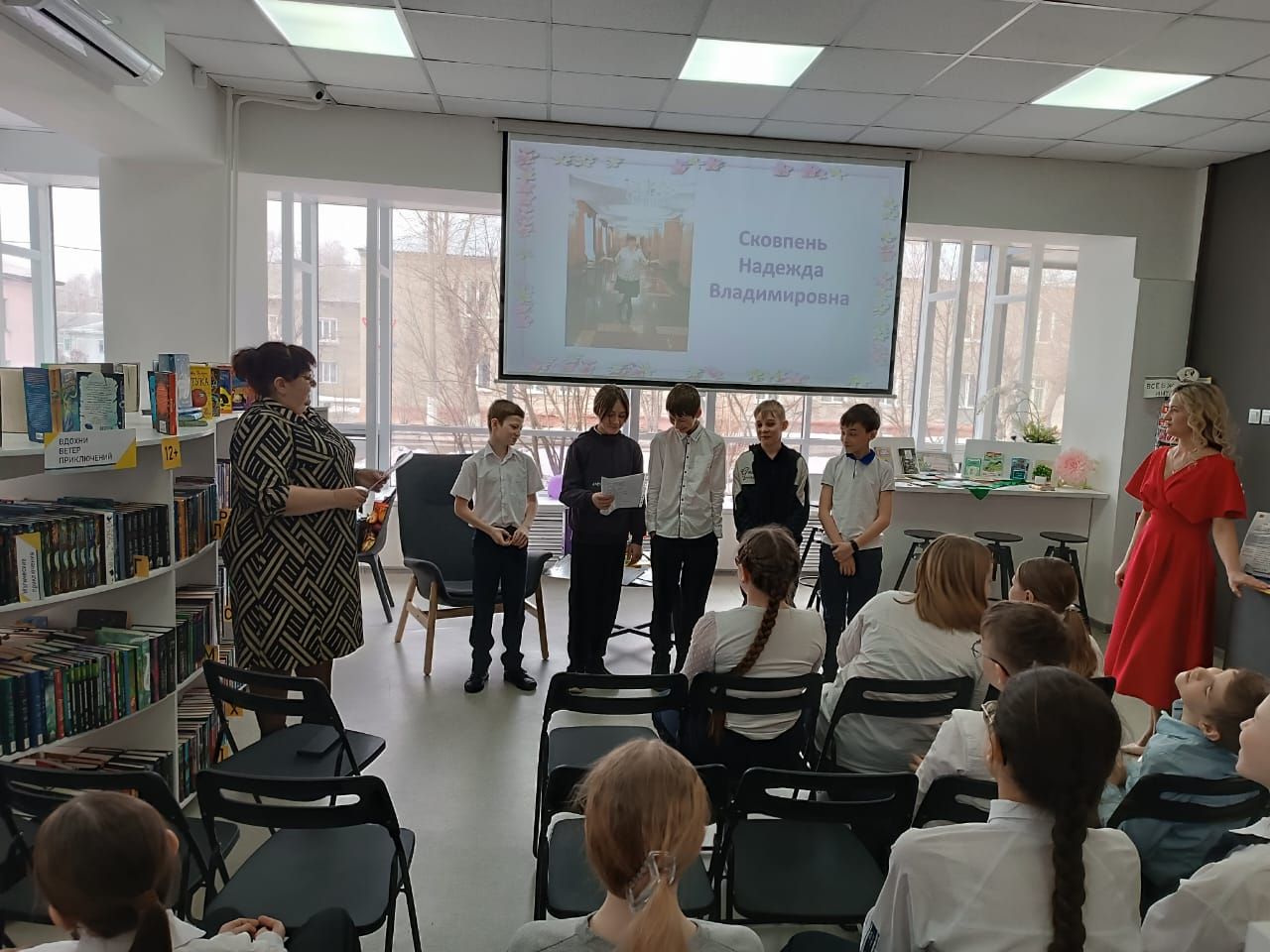 Наш почётный гость – замечательная женщина, наделенная поэтическим даром, оптимистка, активная участница литературного клуба «Вдохновение», победительница районных и городских литературных конкурсов – Сковпень Надежда Владимировна с большим удовольствием поделилась с ребятами своим поэтическим творчеством.