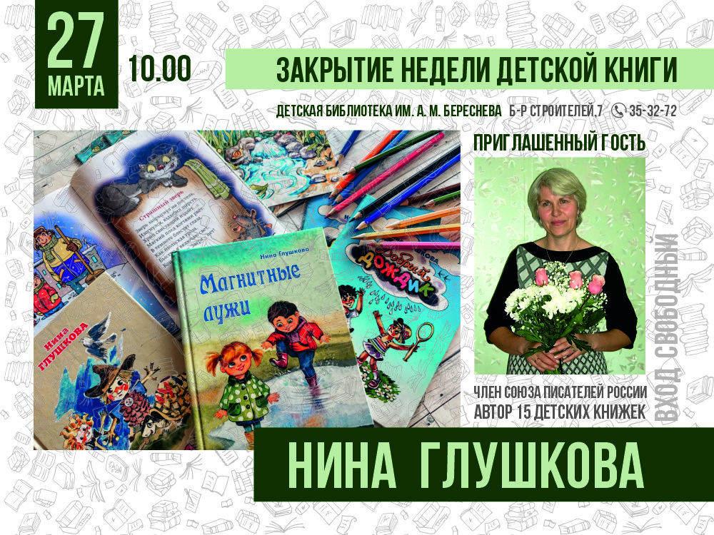 Завершится Неделя детской книги творческой встречей и презентацией новой книги детских стихов Члена Союза писателей России, автора 15 детских книжек Нины Глушковой.